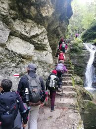 Nous partîmes, en tournant le dos aux gorges, en passant sur les traces de Jean-Jacques Rousseau pour atteindre la grotte de Môtiers et sa cascade. Nous montâmes au départ de celle-ci, avec un premier dénivelé de 70 m. Nous redescendîmes pour prendre le chemin qui nous dirigea vers les gorges, en longeant le ruisseau du Breuil que nous traverserons plusieurs fois. Une surprise nous attend, à une intersection, un bar à absinthe est ouvert. A 4,5 kilomètres du départ et après la montée la plus importante de la journée, nous atteignîmes l'entrée des gorges, avec ses escaliers, ses rampes, sa beauté époustouflante.