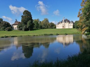 la luge, nous fîmes un petit arrêt vers une très belle borne frontière entre les cantons de Vaud et de Neuchâtel. A partir de cet instant, ce sera du hors piste, à travers bois, pâturages, pour joindre la ferme du Breuil et récupérer le chemin balisé. Dernière montée raide, nous suivîmes la crête, pour arriver au château de Môtiers, propriété de la marque de montres de luxe Bovet, (montre à 68 500 € ). Cette fois, c'est sûr, plus de montées, nous