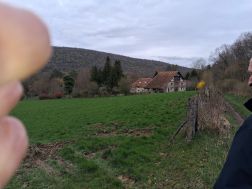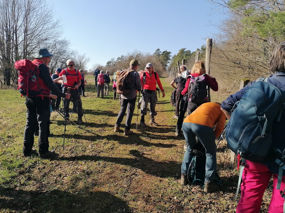 Ça avance bien, la galette de la veille (et son crémant) n’a pas laissé trop de trace dans les jambes, le premier raidillon en sortant de la « levée de Jules César » est franchi vaillamment. Le sentier est humide sans être trop gorgé d’eau, tout va bien le soleil pointe au sud-est il est temps d’enlever une couche. Le sentier est agréable, il redescend vers le village de Fourg que nous effleurons par son flanc sud pour rejoindre la D 441 qui va vers Liesle. Nous entrons dans la forêt et grimpons Le bois de la côte d’or. Le GR est dévié, on fait à contre cœur un peu de bitume ! Un fois la déviation terminée, nous regagnons la crête pour rejoindre le signal sommital 467 m. J’annonce : « on descend, on patauge, on remonte » Un bon coup de cul cependant doit être franchi pour terminer la montée. Quelques encablures après le signal sur le joli sentier en plateau nous nous posons au soleil pour prendre le repas. Les traditionnels partages rendent ces moments toujours très agréables. Nous sommes environ à mi-parcours.